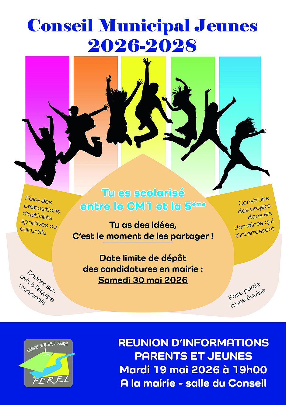 Le19maiDu 19h00 à 20h00 Ajouter à mon calendrierJeunesseRéunion d'information Elections Conseil Municipal JeunesDossier de candidature à déposer en Mairie avant le 30 maiFormulaire_candidature2026.pdfPDF302,2 KoPrécédentRetour à la listeSuivant